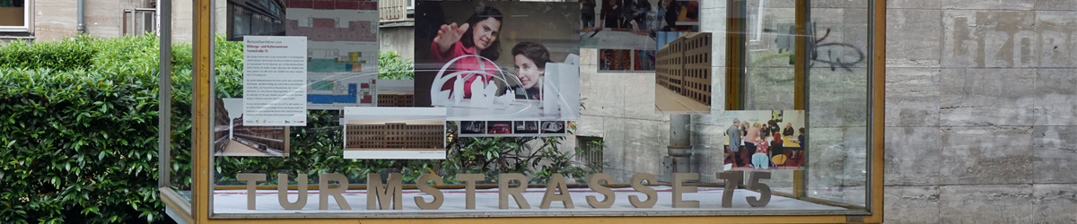 Die Vitrine vor dem Rathaus Tiergarten am Mathilde-Jacob-Platz 1 zeigt aktuell eine Ausstellung zum Werkstattverfahren zum Bildungs- und Kulturzentrum Turmstraße 75. Gezeigt wird der bisherige Projektverlauf sowie erste Ergebnisse der vorrangegangenen Workshops. Interessierte können sich Informationsflyer und Postkarten zum Projekt mitnehmen. Die Ausstellung läuft noch bis zum 30. Juni 2016.