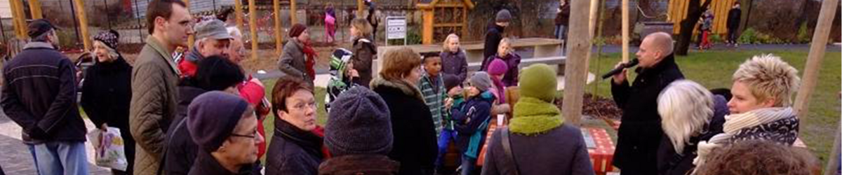 Jung und Alt bei der Einweihungsfeier am 30.11.2012 für Generationenpark, Vorgärten Deulstraße und Spielplatz Wilhelminenhofgeister im ehemaligen Sanierungsgebiet Oberschöneweide