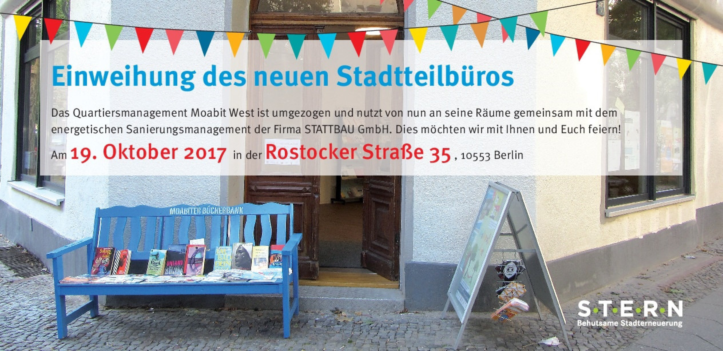 Am 19.10.2017 feiern das Quartiersmanagement Moabit West und das Energetische Sanierungsmanagement Green Moabit die Einweihung ihres gemeinsamen Stadtteilbüros in der Rostocker Straße 35.