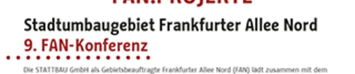 Die STATTBAU GmbH als Gebietsbeauftragte der Frankfurter Allee Nord (FAN) lädt im Auftrag des Bezirksamtes Lichtenberg zweimal im Jahr zu FAN-Konferenzen ein. Alle Interessierten, die im Gebiet Frankfurter Allee Nord wohnen, lernen, arbeiten oder sich engagieren wollen, sind herzlich eingeladen.