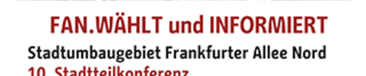 Die STATTBAU GmbH als Gebietsbeauftragte der Frankfurter Allee Nord (FAN) lädt zusammen mit dem FAN-Beirat im Auftrag des Bezirksamtes Lichtenberg zur 10. Stadtteilkonferenz „FAN.WÄHLT und INFORMIERT“ ein. Alle Interessierten, die im Gebiet Frankfurter Allee Nord wohnen, lernen, arbeiten oder sich engagieren wollen, sind herzlich eingeladen: