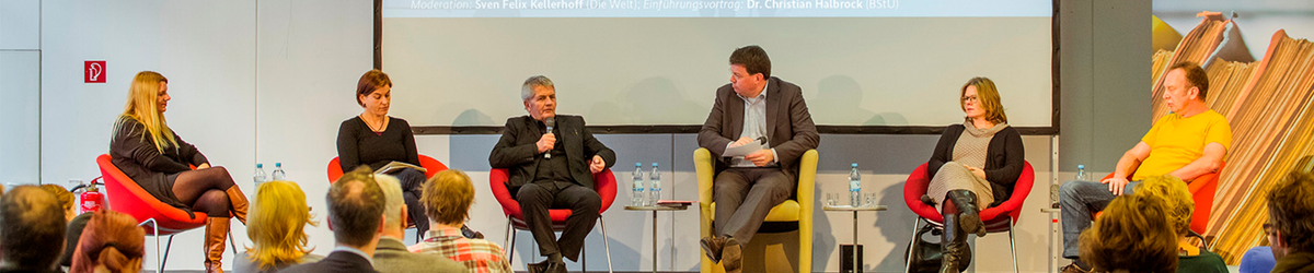Es diskutierten: Constance Cremer, Geschäftsführerin Stattbau, Prof. Dr. Sybille Frank, TU Berlin, Tom Sello, Robert-Havemann-Gesellschaft, Dr. Anna Kaminsky, Bundesstiftung Aufarbeitung, Roland Jahn, Bundesbeauftragter für die Stasi-Unterlagen und Moderator Sven Felix Kellerhoff, Die Welt.