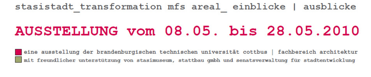 Die Ausstellung der Brandenburgischen Technischen Universität Cottbus | Fachbereich Architektur stasistadt_transformation mfs areal_ einblicke | ausblicke wird vom 08.05.bis 28.05.2010 im Stasimuseum Ruschestraße 103, Haus 1 zu besichtigen sein: